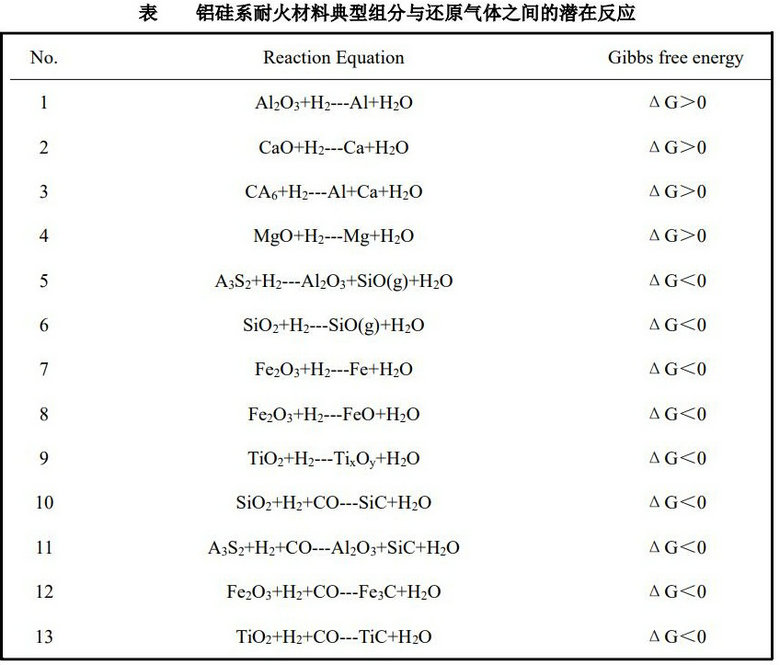鋁硅系耐火材料主要成分在純氫以及 H2/CO 混合氣氛下的熱力學(xué)平衡,經(jīng)過(guò)計(jì)算和分析可以得到以下結(jié)論: