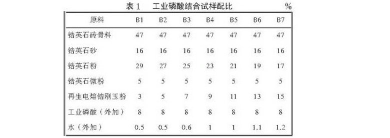 試驗(yàn)采用的主要原料有:鋯英石磚骨料(0~3mm)、鋯英石砂(80~150目)、鋯英石粉(≤0.045mm)、鋯英石微粉(≤0.002mm)、再生電熔鋯剛玉粉(≤0.045mm)、工業(yè)磷酸(85%)。其配比方法見下表1;