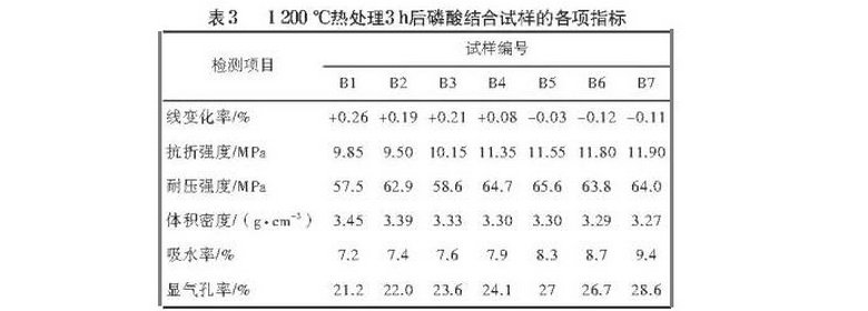 從表中可以看出磷酸結(jié)合試樣B1~B7的硬化時(shí)間在32~34h。在經(jīng)過1200℃熱處理后3h后的試樣各項(xiàng)指標(biāo)列于表3,從表3中可以看出,隨著再生鋯剛玉粉占比的增加,試樣的耐壓強(qiáng)度并無(wú)規(guī)律性的變化,抗折強(qiáng)度又波動(dòng)增大的趨勢(shì);線變化率隨著再生鋯剛玉粉的增加,收縮增大;體積密度隨著再生鋯剛玉粉的增加而減小,吸水率、顯氣孔率隨著再生鋯剛玉粉的增大而增大。