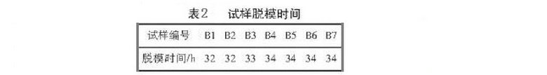 工業(yè)磷酸結(jié)合試驗(yàn)過程,將按照表內(nèi)的配料,放入攪拌鍋中攪拌2min,加入磷酸混煉3min,搗打成型為40mmX40mm160mm的試樣,在室溫養(yǎng)護(hù),終凝后脫模,記錄脫模時(shí)間,然后再130℃干燥箱中干燥24h,于1200℃分別保溫3h熱處理。以下表2是試樣的脫模時(shí)間: