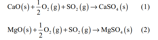 銅冶煉中硫化物由于氧化形成氣態(tài)SO2,并遷移到耐火磚中,隨著溫度降低到1050℃以下,SO2 轉(zhuǎn)變?yōu)?/span> SO3 的硫氧化物會與鎂鉻磚中氧化物反應,生成主要由MgSO4和CaSO4 組成的低熔點堿土金屬硫化物,導致鎂鉻質(zhì)耐火材料成分的變化。其次 SO2–O2 的氣體擴散到殘磚冷面的類原磚層,由于晶界處的鈣鎂橄欖石的離解,氣相介質(zhì)中SO2/SO3 與磚中CaO 反應生成 CaSO4。分析證實,殘磚冷面反應層存在 CaSO4 物相。當氧分壓為10-9 ~10–5MPa,SO2分壓為0.01~0.10 MPa,熔煉溫度在1200℃條件下,硫酸鎂的形成溫度為 700~800 ℃。MgO與氣體中的SO2反應生成 MgSO4,式(1)和式(2)相關反應會引起體積膨脹,當爐襯溫度下降時,耐火材料冷面形成的 MgSO4 再分解成 MgO,MgSO4 密度低,僅為 2.66 g/cm3,而MgO的密度為3.58 g/cm3。因此,MgSO4 分解所形 成的 MgO 結(jié)構(gòu)較為疏松,最后導致該處的鎂鉻耐火材料更易受到爐渣等介質(zhì)的侵蝕。