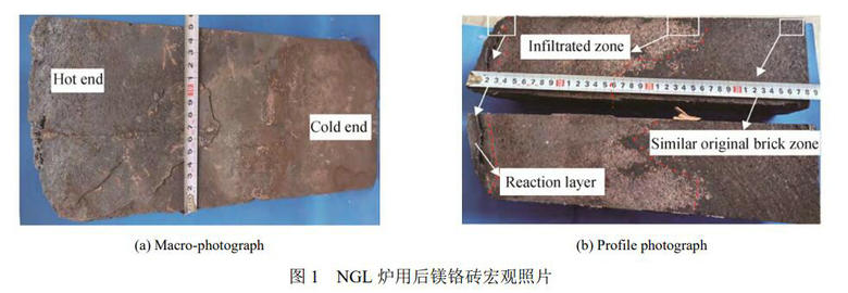 NGL 精煉爐對廢雜銅再生利用有重要意義,能緩解銅精礦資源的不足。然而 NGL 精煉爐廢雜銅所含雜質(zhì)過多(含 Pb、Zn、As、Ni、Fe 等金屬元素)且需反復氧化和造渣,致使爐襯耐火材料服役環(huán)境苛刻。通過分析NGL 爐用后鎂鉻磚宏觀形貌、 物相組成及顯微結(jié)構(gòu),以期揭示 NGL 廢雜銅精煉爐用鎂鉻磚的損毀機理,為銅冶煉用耐火材料的發(fā)展和應用提供更多的科學依據(jù)。
