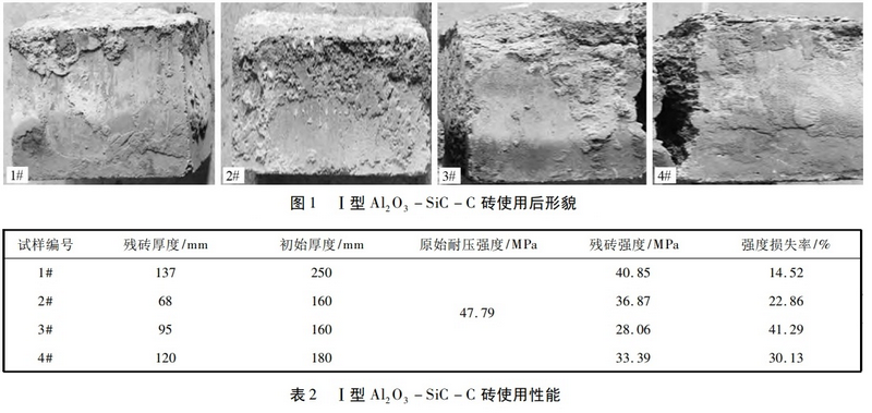 某鋼廠采用“一包到底”工藝,高爐受鐵、鐵水運(yùn)輸、KR攪拌脫硫等操作完全在鐵水包內(nèi)進(jìn)行。目前鐵水包容量為300 t和210 t,KR脫硫率為100%,脫硫攪拌頭轉(zhuǎn)速120~160 rad /min ,脫硫時(shí)間20~25 min,脫硫劑為石灰+氟化鈣,噸鐵消耗13~16 kg。前期選Ⅰ型Al2O3-SiC -C磚作為鐵水包的工作襯,侵蝕速率達(dá)0.6 mm /爐次,包壁侵蝕不均勻,尤其是渣線部位侵蝕嚴(yán)重。為研究高脫硫比鐵水包內(nèi)Ⅰ型 Al2O3-SiC-C磚的侵蝕機(jī)理,提高鐵水包在線運(yùn)行的安全性,需對(duì)Ⅰ型Al2O3-SiC-C磚進(jìn)行性能分析。Ⅰ型Al2O3-SiC-C磚使用后形貌及實(shí)際性能分別見圖1和表2。