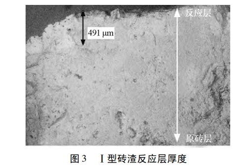 圖3為Ⅰ型 Al2O3-SiC-C 磚使用后磚渣反應(yīng)層厚度。可見,拆解后的Ⅰ型Al2O3-SiC-C 磚反應(yīng)層厚度很薄,說明反應(yīng)產(chǎn)生的低熔物較多,磚面幾乎沒有保護(hù)層,導(dǎo)致低熔物不斷生成,連續(xù)被鐵水沖刷消耗,侵蝕速度大大增加。