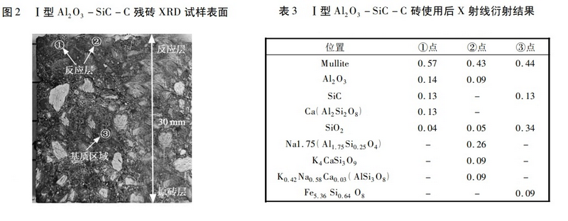 可見,Ⅰ型Al2O3-SiC-C磚在鐵水包包嘴和圍罐兩處鐵水沖刷較嚴(yán)重的部位受損嚴(yán)重,同時(shí)殘磚耐壓強(qiáng)度損失較大,表明Ⅰ型 Al2O3-SiC-C磚高溫狀態(tài)下抗鐵水沖刷性能不佳。對(duì)拆除的Ⅰ型Al2O3-SiC-C磚進(jìn)行物相檢測,試樣表面及檢測位置見圖 2。衍射結(jié)果見表3。