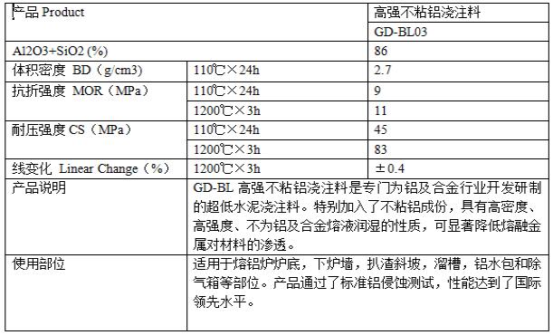 此系列材料以高純莫來石、紅柱石、硅線石為基料的低水泥含量、超微粉結(jié)合的新型材料。由于選用高純原料、超微粉結(jié)合,此系列材料具有高體積密度、高強(qiáng)度、良好熱震穩(wěn)定性,通過添加適量的“不潤濕劑”(如高純氧化鉻、復(fù)合鋇鹽、復(fù)合鋅鹽等),能大幅度降低鋁及合金、熔渣對耐火材料的潤濕性,提高了耐火材料對含鹽分、助熔劑等化學(xué)成分的鋁液的抗腐蝕性、抗沖刷性、不沾鋁和渣功能,即阻止了鋁及合金、熔渣滲入耐火材料,延長爐襯壽命。非常適用于熔化爐、靜置爐、流槽、鋁包內(nèi)襯。