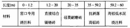 從窯頭至窯尾0m~60m耐火材料的配置見表1。