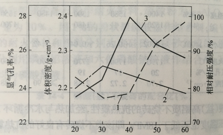 1—顯氣孔率;2—體積密度;3—相對耐壓強(qiáng)度